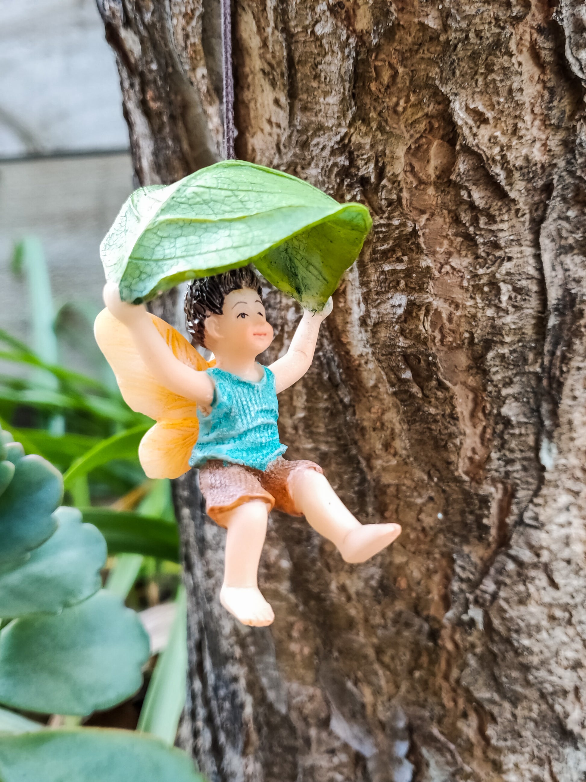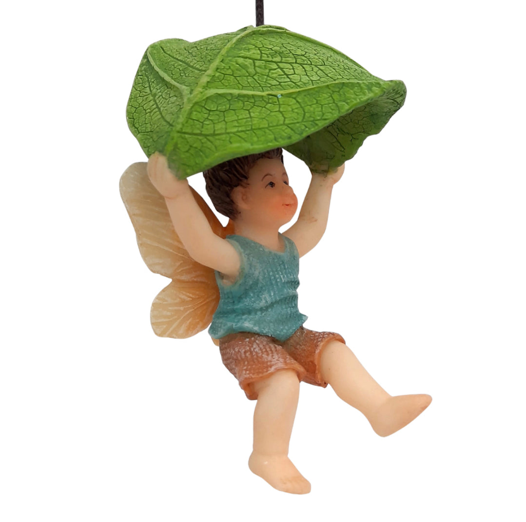 This adventurous little boy fairy is having so much fun floating around underneath his leaf parachute. A great gift idea as a bedroom decoration or as an addition to your garden.